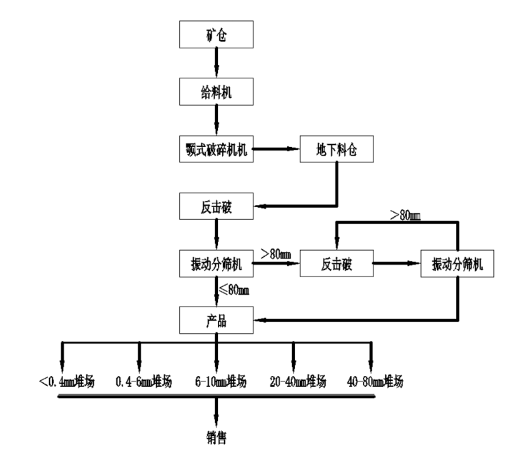 礦山現(xiàn)有破碎站采用兩級破碎、兩級篩分的閉路返回流程,機械化程度較高,可將礦石加工成不同需求的五級原料。破碎后的礦石原料對外進行銷售,礦石加工工藝系統(tǒng)流程圖如下: