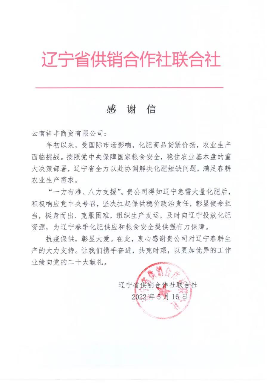 2022年5月16日,云南祥豐商貿(mào)有限公司收到一封來自遼寧省供銷合作社聯(lián)合社的感謝信,對云南祥豐商貿(mào)有限公司為遼寧春季化肥供應和糧食安全提供強有力保障,大力支持遼寧春耕生產(chǎn)表示感謝。感謝信中指出,年初以來,受國際市場影響,化肥商品貨緊價揚,...