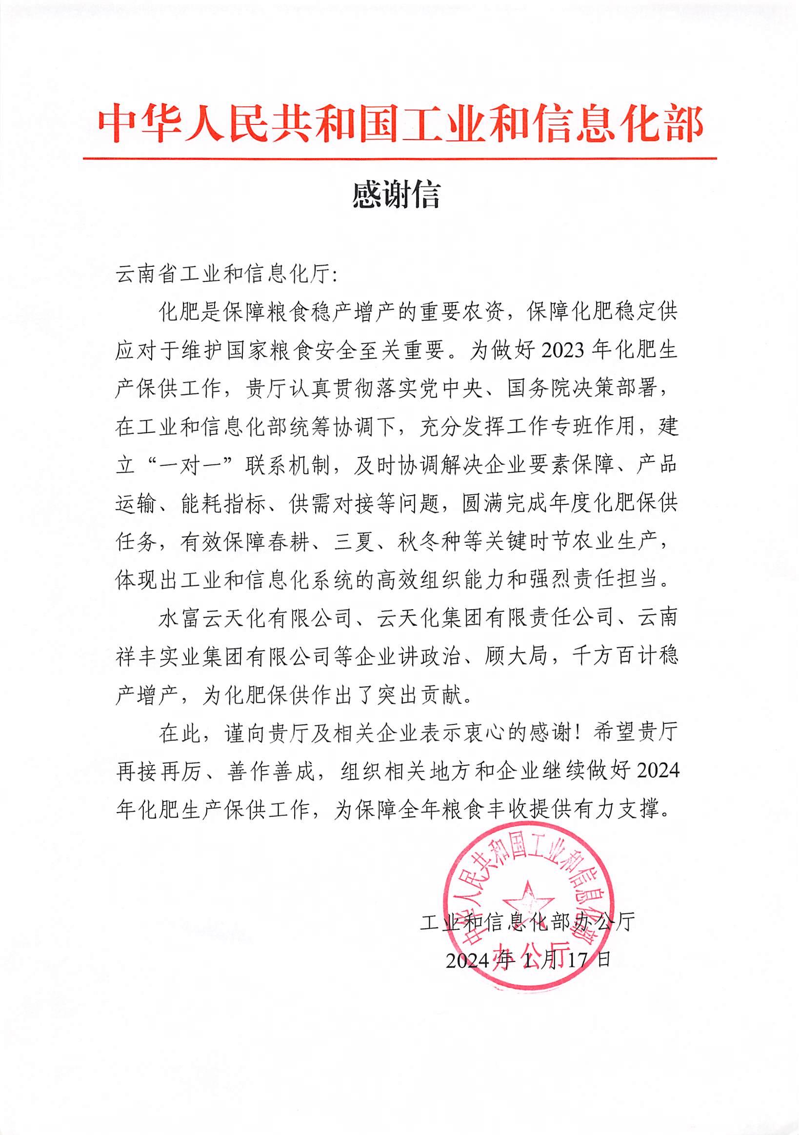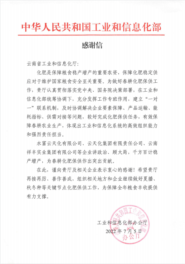 2022年7月5日,工業(yè)和信息化部發(fā)來感謝信,對云南祥豐實業(yè)集團有限公司講政治、顧大局,千方百計穩(wěn)產(chǎn)增產(chǎn),為春耕化肥保供作出突出貢獻表示衷心的感謝。感謝信中指出,化肥是保障糧食穩(wěn)產(chǎn)增產(chǎn)的重要農(nóng)資,保障化肥穩(wěn)定供應對于維護國家糧食安全至關重要...