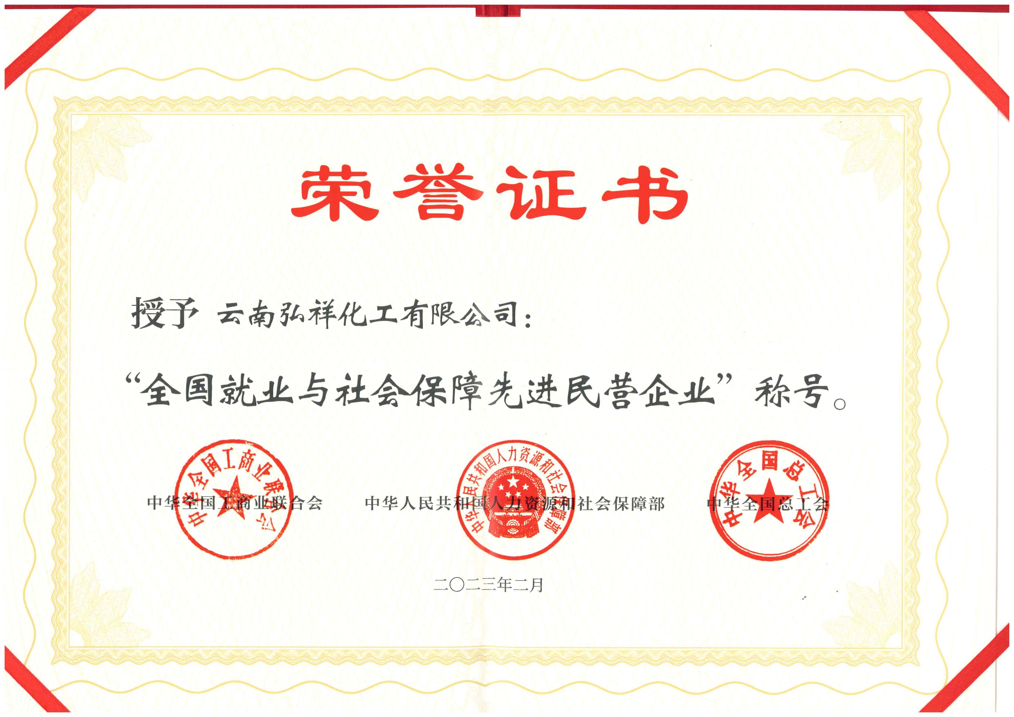 云南弘祥化工有限公司榮獲“全國(guó)就業(yè)與社會(huì)保障先進(jìn)民營(yíng)企業(yè)”稱(chēng)號(hào)