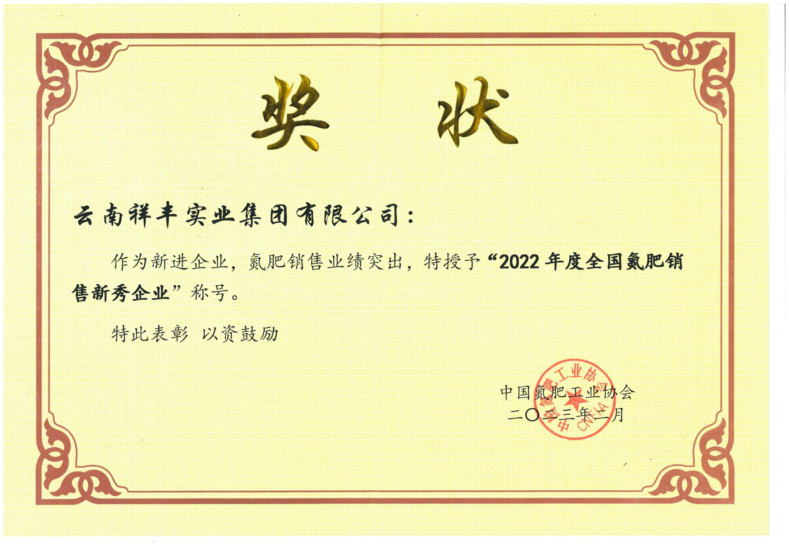 榮獲“2022年度全國(guó)氮肥銷(xiāo)售新秀企業(yè)”稱(chēng)號(hào)